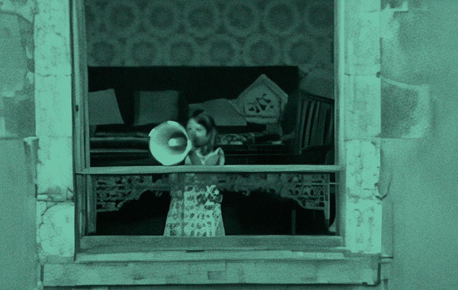 Sylvie risponde a modo suo. Afferra il megafono del padre, corre sul balcone e inizia a urlare: