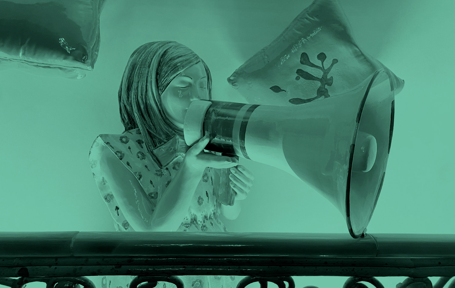Tra la miriade di bottiglie, lo sguardo è immediatamente catturato dalla bambina e dal suo megafono, che trasformano questa stanza silenziosa in un vibrante paesaggio di idee.