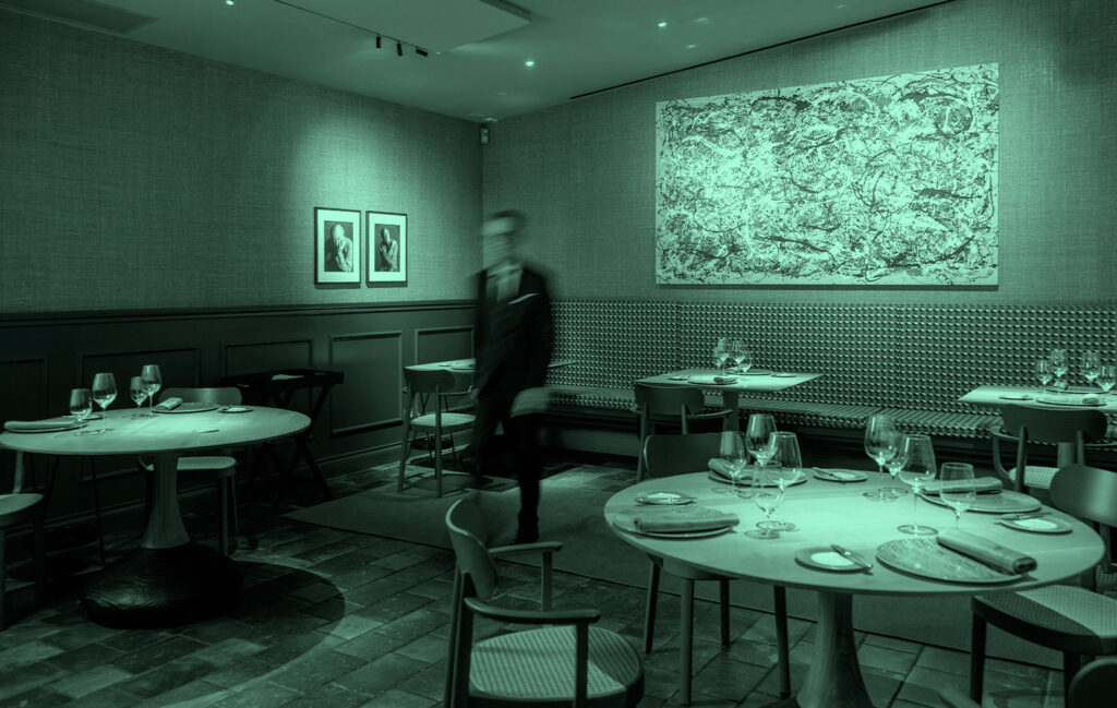 Nell’agosto del 2023 il ristorante era pronto ad aprire con tre straordinari lavori di Bidlo: Not (Pollock), Not (Stella), Not (Warhol).
